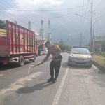 TANGGAMUS – Polsek Pugung Polres Tanggamus melakukan penyiramaan jalan licin tumpahan solar dari sebuah mobil yang tidak diketahui di Jalan Lintas Barat